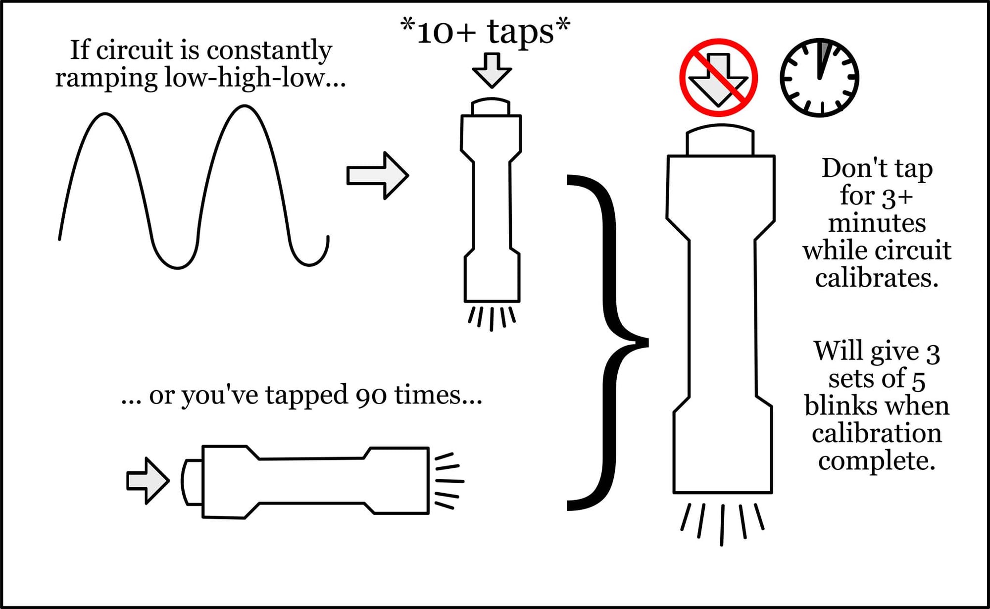 Calibration takes approximately 1 minute – your light will ramp slowly down measuring LED current and setting values appropriately. When calibration is complete, a small light show (3 sets of 5 blinks) will occur. You can re-run calibration at any time from the Quick Access Menu.